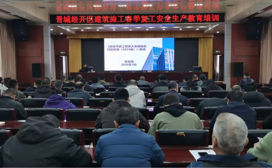 为切实筑牢建筑施工春季复工安全生产防线,有效防范化解节后复工复产各类安全风险,坚决遏制生产安全事故发生,确保建筑施工项目安全、有序、平稳复工。3月24日,晋城经开区举办2026年度建筑施工春季复工安全教育培训。全区施工项目负责人、专职安全管理人员、项目总监和部门监管人员100多人参加了此次培训活动。